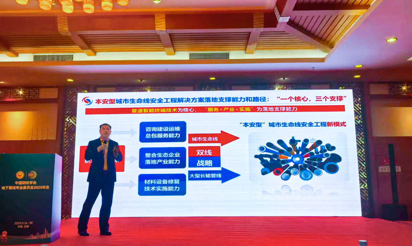 在展会同期举办的“城市生命线数字化暨第八届智慧管网发展交流会”上,东宏股份城市生命线事业部总经理师晋锋发表《东宏本安型“新模式”筑牢城市生命线》主题演讲,深入阐释了以管道智能终端为核心,结合咨询建设运维总包服务、生态整合与修复技术的“本安型城市生命线安全工程”新模式。这一创新模式不仅展现了东宏股份在系统落地与服务赋能方面的综合实力,更为行业未来发展提供了重要参考。