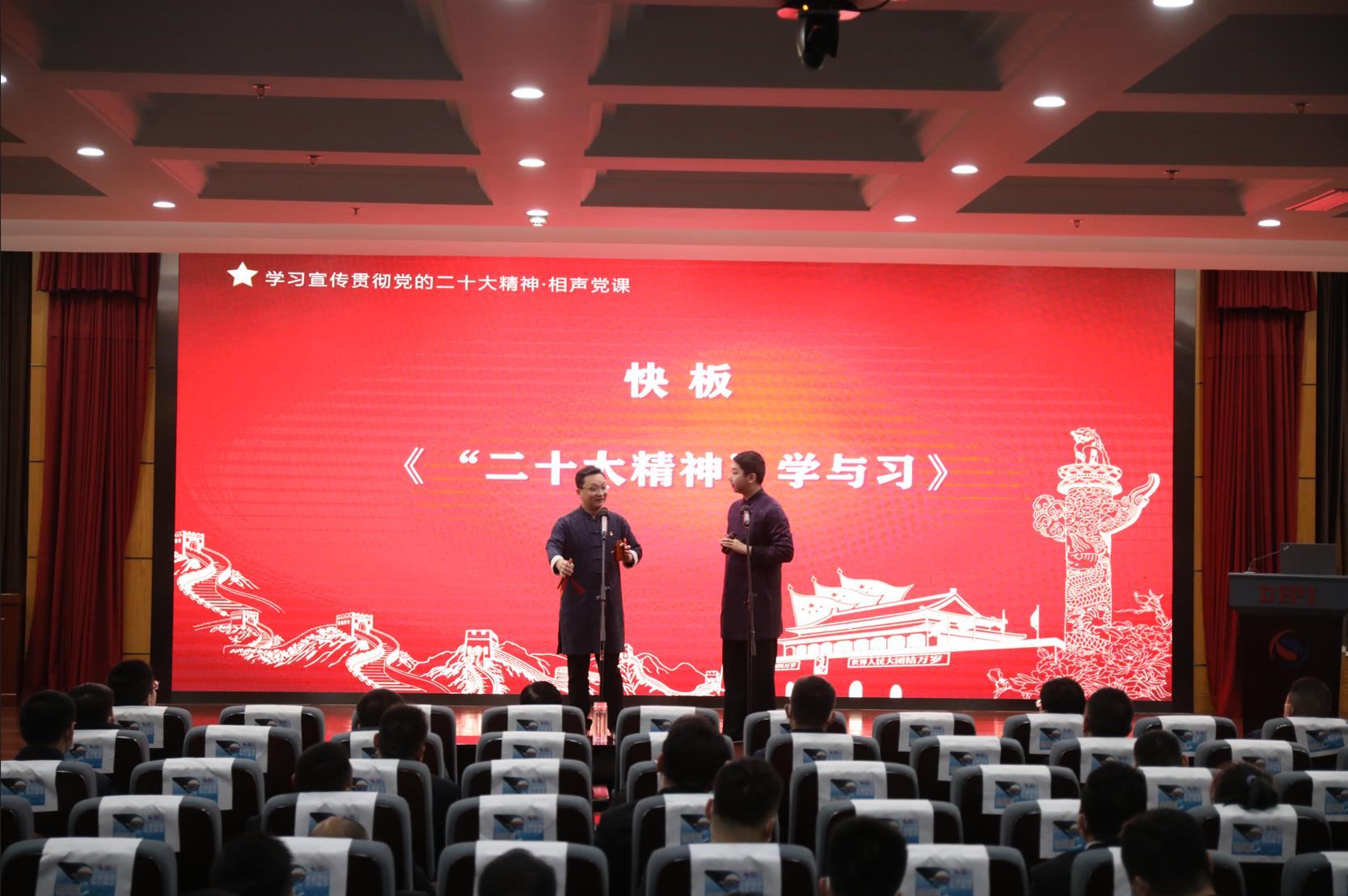 本次主题党课培训主要分为曲阜市“习语润儒乡·杏坛新语”宣讲和东宏集团党委“党员作风承诺书”宣贯两部分内容。宣讲活动由相声、快板书演员赵松涛带领松涛剧场团队,把党的二十大精神和传统优秀文化贯穿到群众喜闻乐见的相声、快板书节目中,为全体参会人员奉献了一场别开生面的党课学习,现场掌声雷动,洋溢着热烈、欢乐、祥和的气氛。东宏集团纪委书记卢勇领学了“党员作风承诺书”并带领全体党员在承诺书上庄严签字。